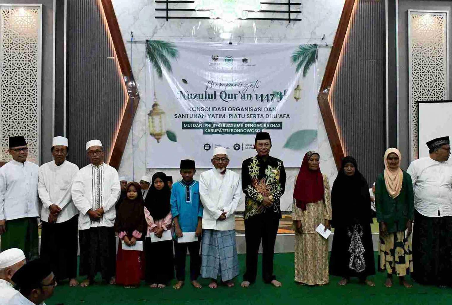 Bupati Bondowoso, Dr. H. Abdul Hamid Wahid, M.Ag., menghadiri rangkaian acara peringatan Nuzulul Qur’an 1447 Hijriah yang dirangkaikan dengan Konsolidasi Organisasi serta Santunan Anak Yatim dan Dhuafa. Perhelatan khidmat ini diselenggarakan oleh Majelis Ulama Indonesia (MUI) dan Ikatan Persaudaraan Haji Indonesia (IPHI) yang bekerja sama dengan BAZNAS Kabupaten Bondowoso, bertempat di Graha NU Bondowoso, Sabtu (07/03/2026).