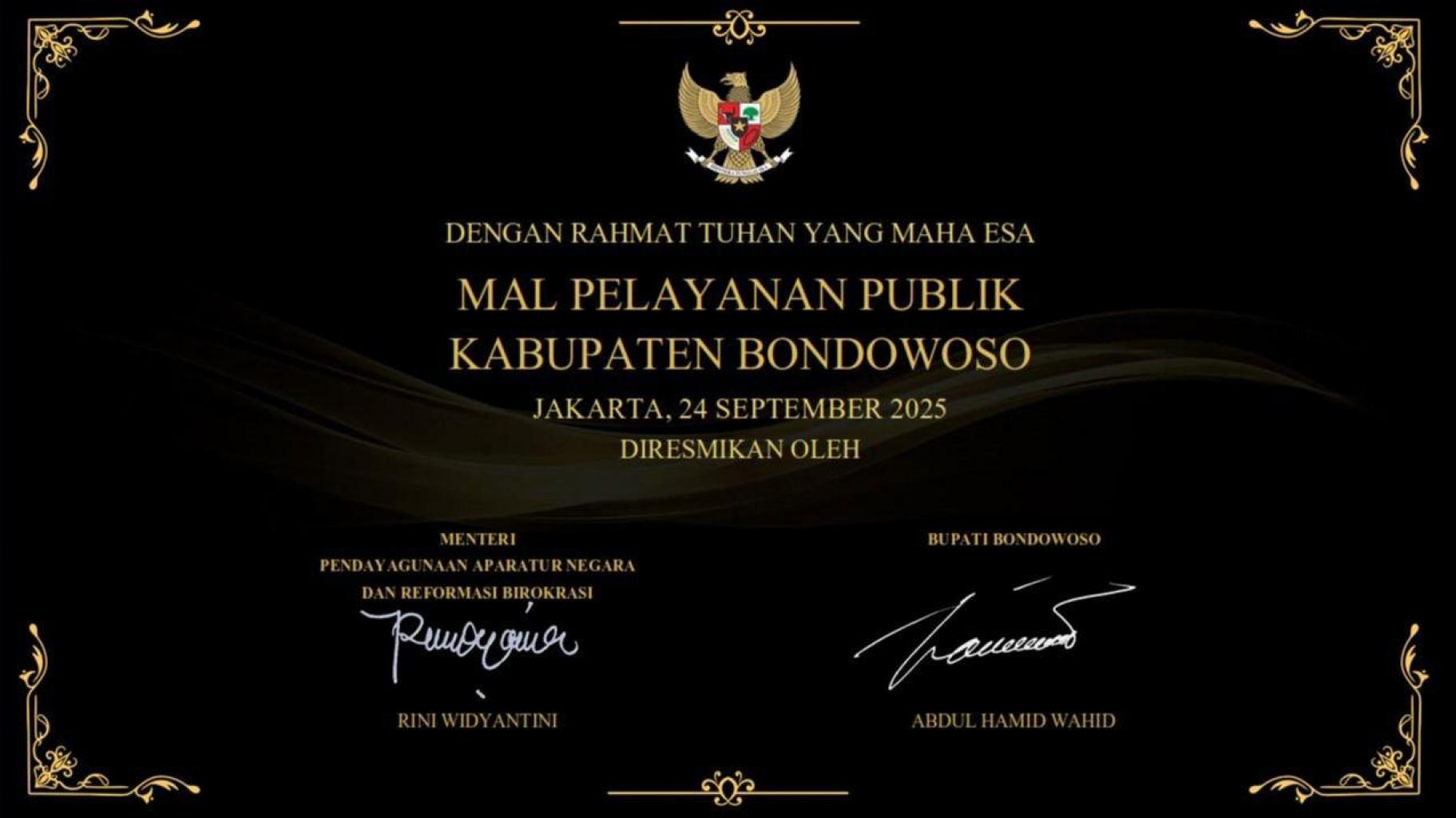 BONDOWOSO - Kementerian Pendayagunaan Aparatur Negara dan Reformasi Birokrasi (PANRB) RI terus berupaya mempercepat transformasi pelayanan publik di Indonesia. Hal ini ditandai dengan peresmian 11 Mal Pelayanan Publik (MPP) secara serentak yang dilakukan oleh Menteri PANRB Rini Widyantini secara daring, Rabu, (24/09/2025).