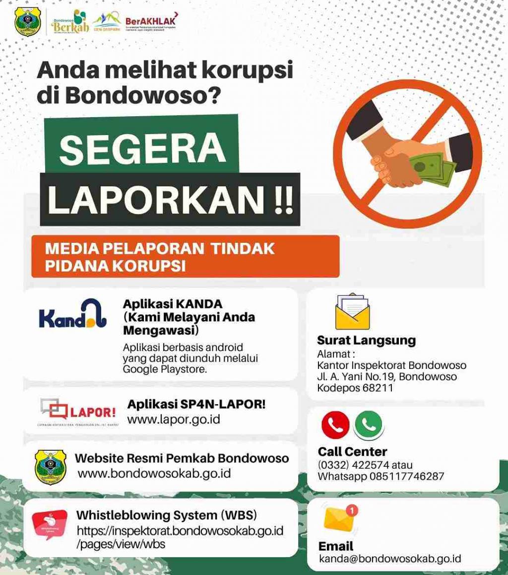 BONDOWOSO – Untuk memperkuat upaya pemberantasan korupsi, Pemerintah Bondowoso mengajak masyarakat untuk berperan serta aktif dalam memberantas segala bentuk korupsi yang sangat merugikan negara. Segera laporkan jika masyarakat melihat atau mengetahui kegiatan yang mengarah pada tindak pidana korupsi.